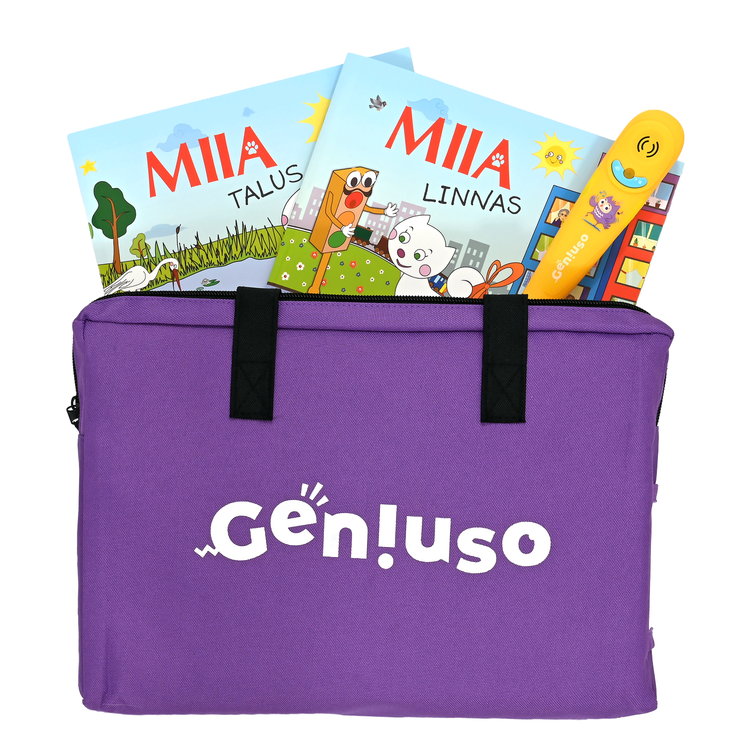 Geniuso MIIA põhikomplekt: pliiats, rääkivad raamatud "Talus" ja "Linnas" ning kandekott